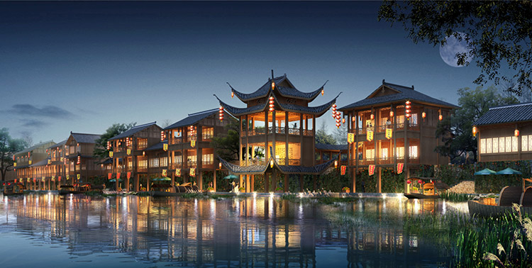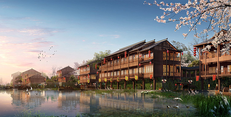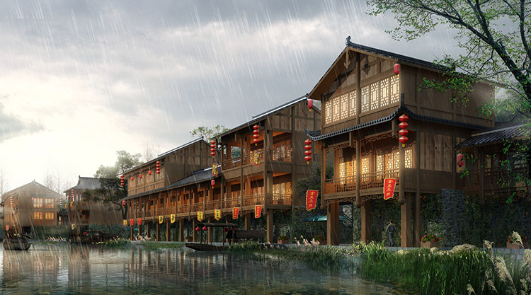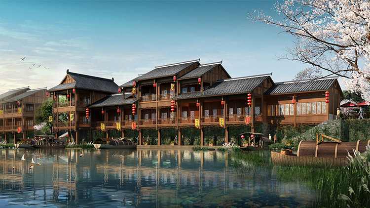 栗河吊腳樓沿河呈狹長不規(guī)則帶狀,南北向進(jìn)深約25m,東西向?qū)捈s527m。項(xiàng)目占地面積12486.41平米(18.73畝),總建筑面積4520.87平米,分為A至J十個(gè)單體建筑,建筑層數(shù)1~2層,門面商鋪45間,沿河道均勻分布。建筑依據(jù)場(chǎng)地,與南側(cè)道路平行布置,建筑主入口面向場(chǎng)地南側(cè)道路,建筑沿河布局,底部1層為架空空間,其上為主體建筑,建筑整體風(fēng)格風(fēng)貌為仿明清時(shí)代,外觀簡潔、大方,給人以明朗、周正的空間體驗(yàn)。契合時(shí)代新形象,尺度更為親切。場(chǎng)地內(nèi)部景觀主要由硬質(zhì)景觀與軟質(zhì)景觀共同構(gòu)成。硬質(zhì)景觀主要包括廣場(chǎng)、步道和活動(dòng)場(chǎng)地,軟質(zhì)景觀主要是綠化種植。
